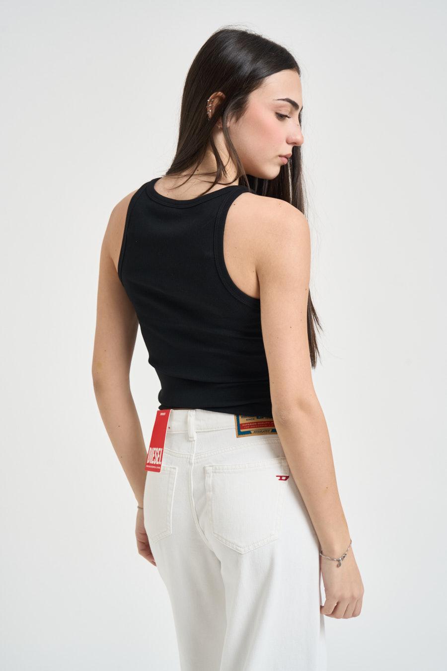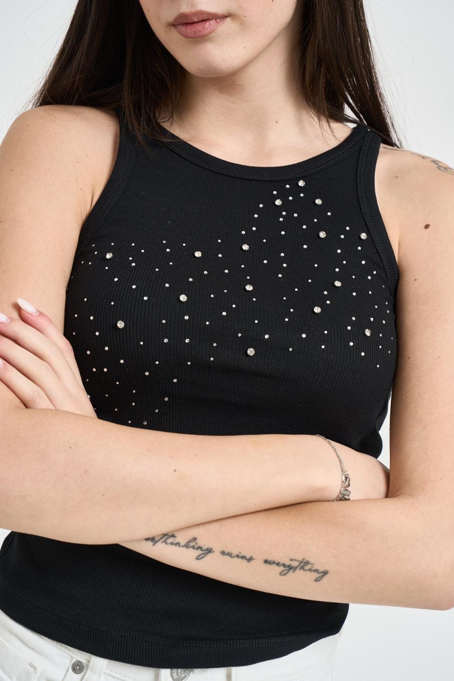 ONLY Top donna girocollo nero con strass. Modello senza maniche, regular fit. Composizione: 95% Cotone 5% Elastane. La modella è alta 172cm e indossa la taglia S.