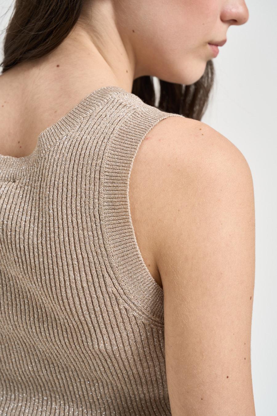 VICOLO Top donna in maglia lurex oro. Modello smanicato con scollo rotondo e struttura a costine verticali, caratterizzato da filati luminosi che donano un raffinato effetto brillante. Vestibilità aderente che valorizza la silhouette, con finiture a costine su collo e giromanica per un comfort ottimale. Composizione: 70%viscosa 15%poliestere 15%nylon. La modella è alta 172 cm e indossa la taglia unica.