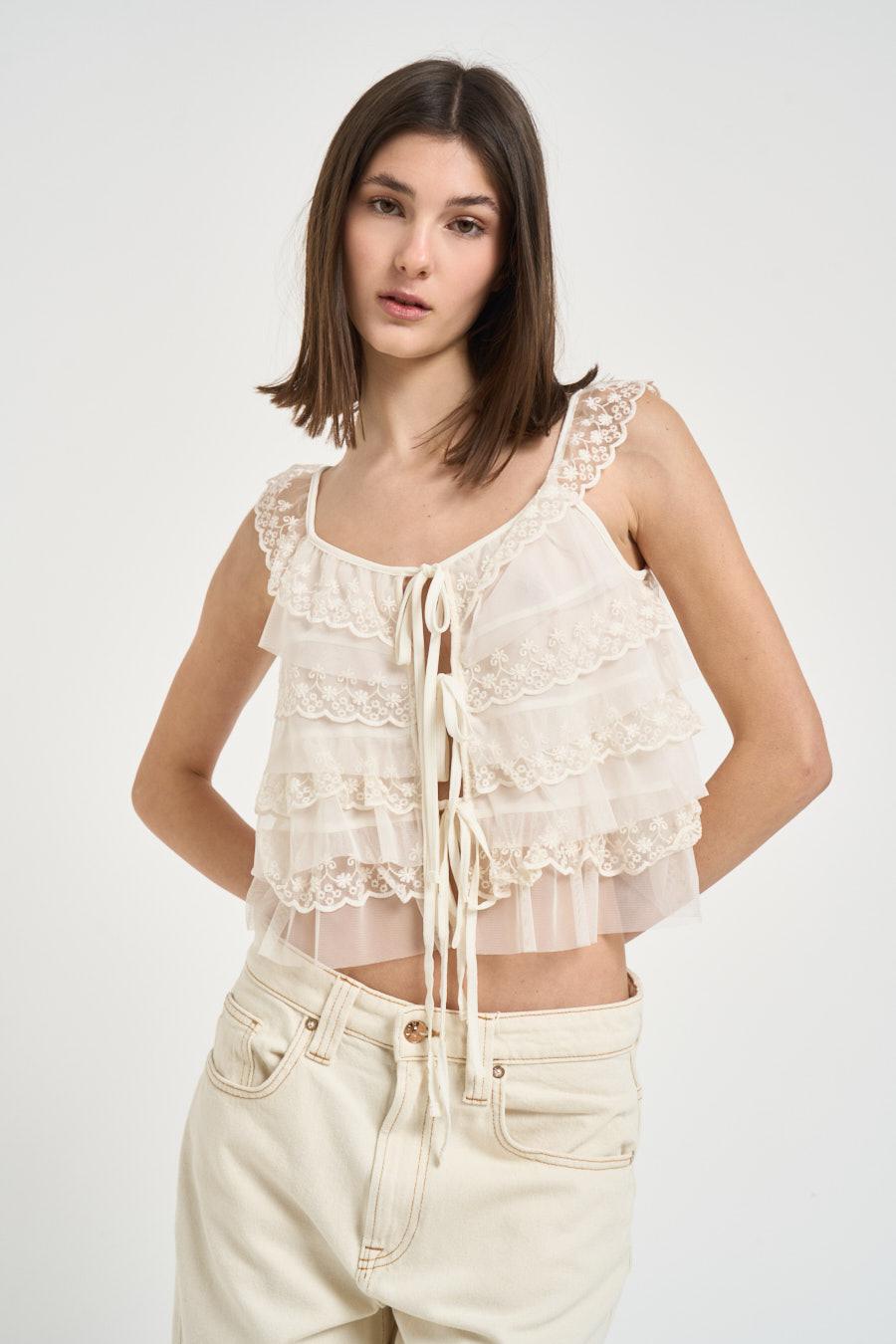 VICOLO Top donna in tulle avorio. Modello con spalline sottili e scollo arrotondato, arricchito da un design a balze sovrapposte che donano movimento e un effetto leggero. Il capo è impreziosito da dettagli in pizzo lungo i bordi e da una chiusura frontale con laccetti sottili. Struttura semi-trasparente con ricami raffinati che esaltano la texture del tessuto. Vestibilità morbida e fluida. Composizione: 100% poliestere. La modella è alta 176 cm e indossa la taglia S.
