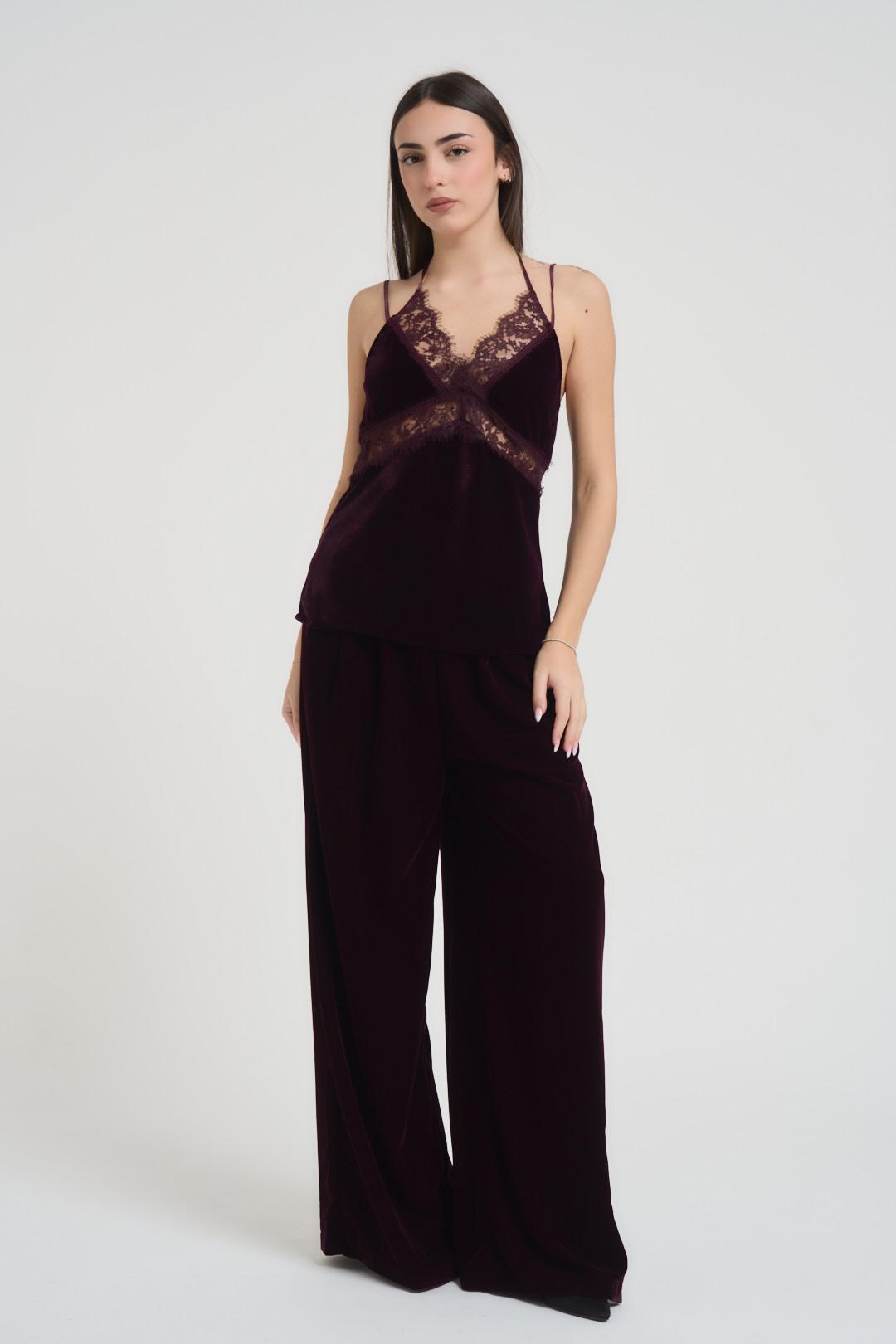 VICOLO Top donna in velluto bordeaux. Modello con spalline fine e allacciatura sul collo, dettaglio in pizzo sullo scollo a V. Composizione: poliestere. La modella è alta 172 cm e indossa la taglia S.