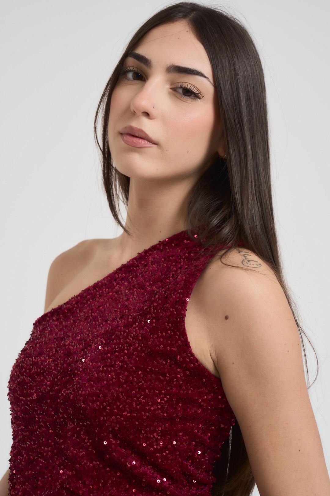 LOKITA MILANO Top donna monospalla con paillettes bordeaux. Modello slim fit e cropped. Composizione: poliestere e viscosa. La modella è alta 172 cm e indossa la taglia S.