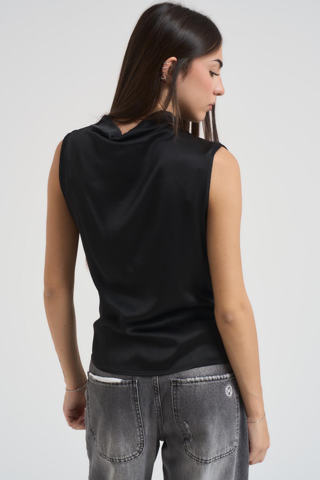 VITTO Top donna smanicato satinato nero. Modello drappeggiato a mezzo collo, senza maniche. Composizione: 97% viscosa 3% elastane. La modella è alta 172 cm e indossa la taglia S/M.