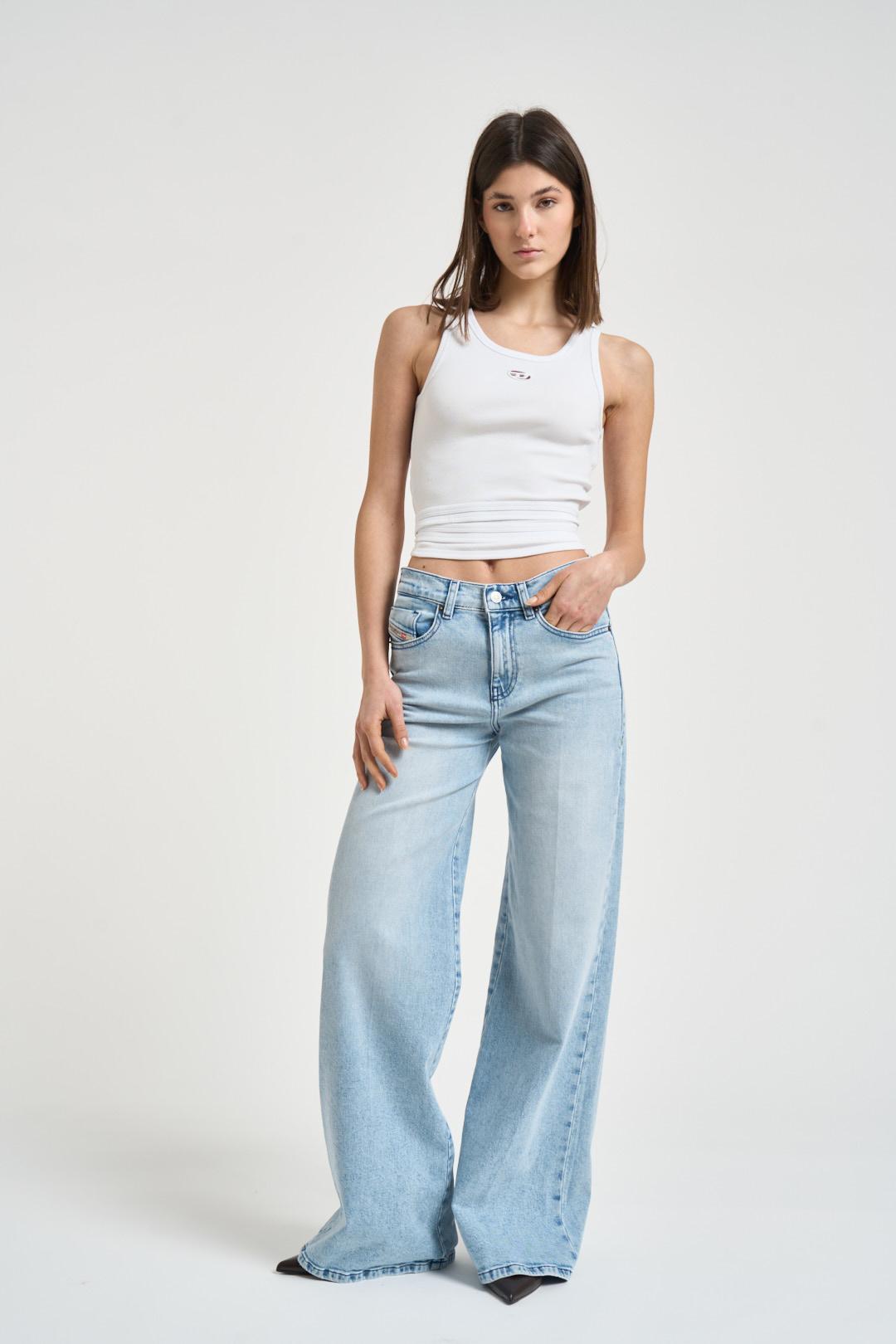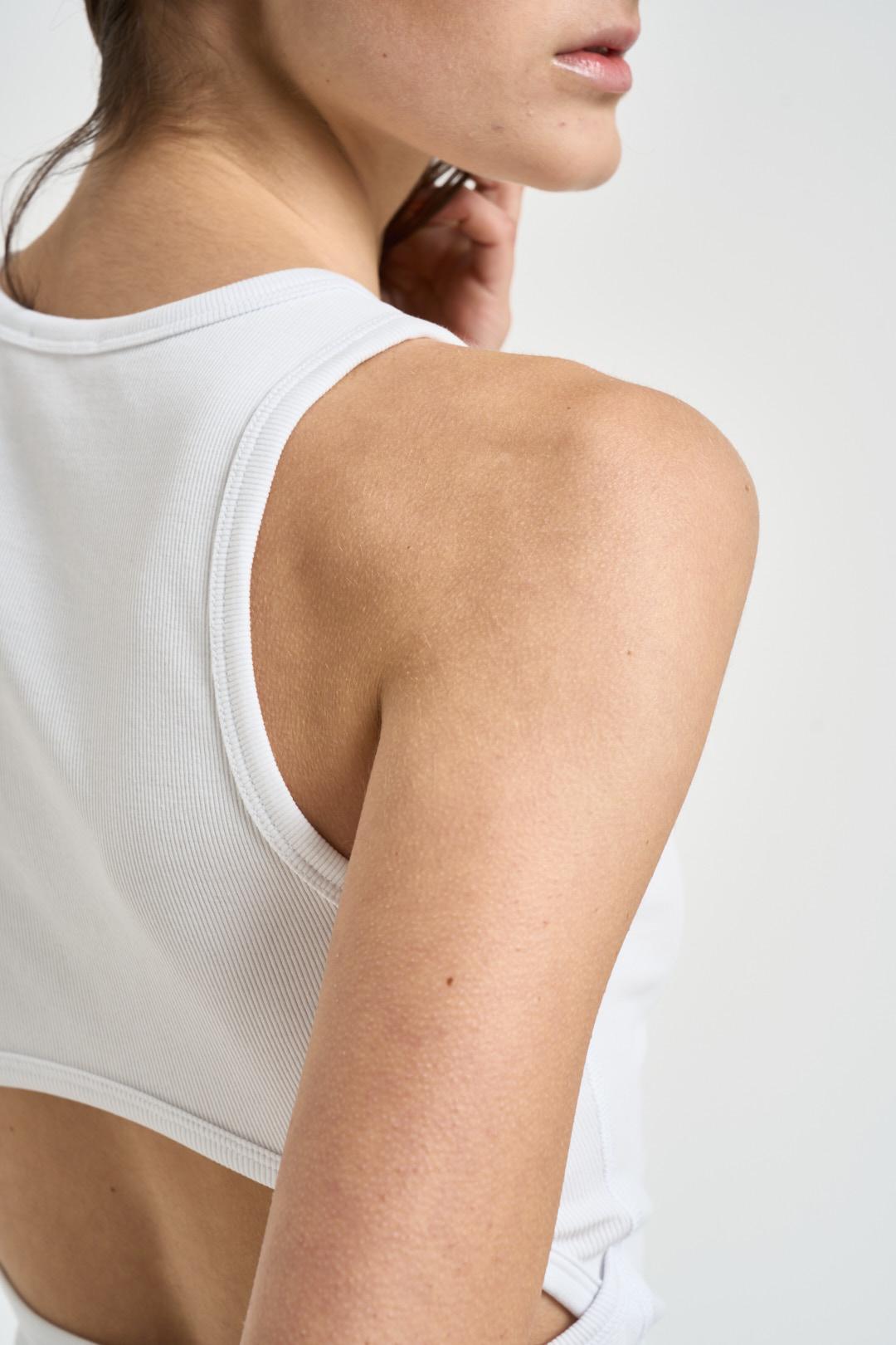 DIESEL Top donna T-anky cropped bianco. Modello vestibilità aderente, cotone elasticizzato con costine sottili, senza maniche e con distintive stringhe che si legano in vita. Sul davanti ricamo laserato Oval D appena sotto il colletto, mentre il retro è aperto sulla schiena grazie a un orlo più corto che crea un effetto cut-out. Composizione: 94%Cotone 6%Elastan. La modella è alta 176 cm e indossa la taglia S.