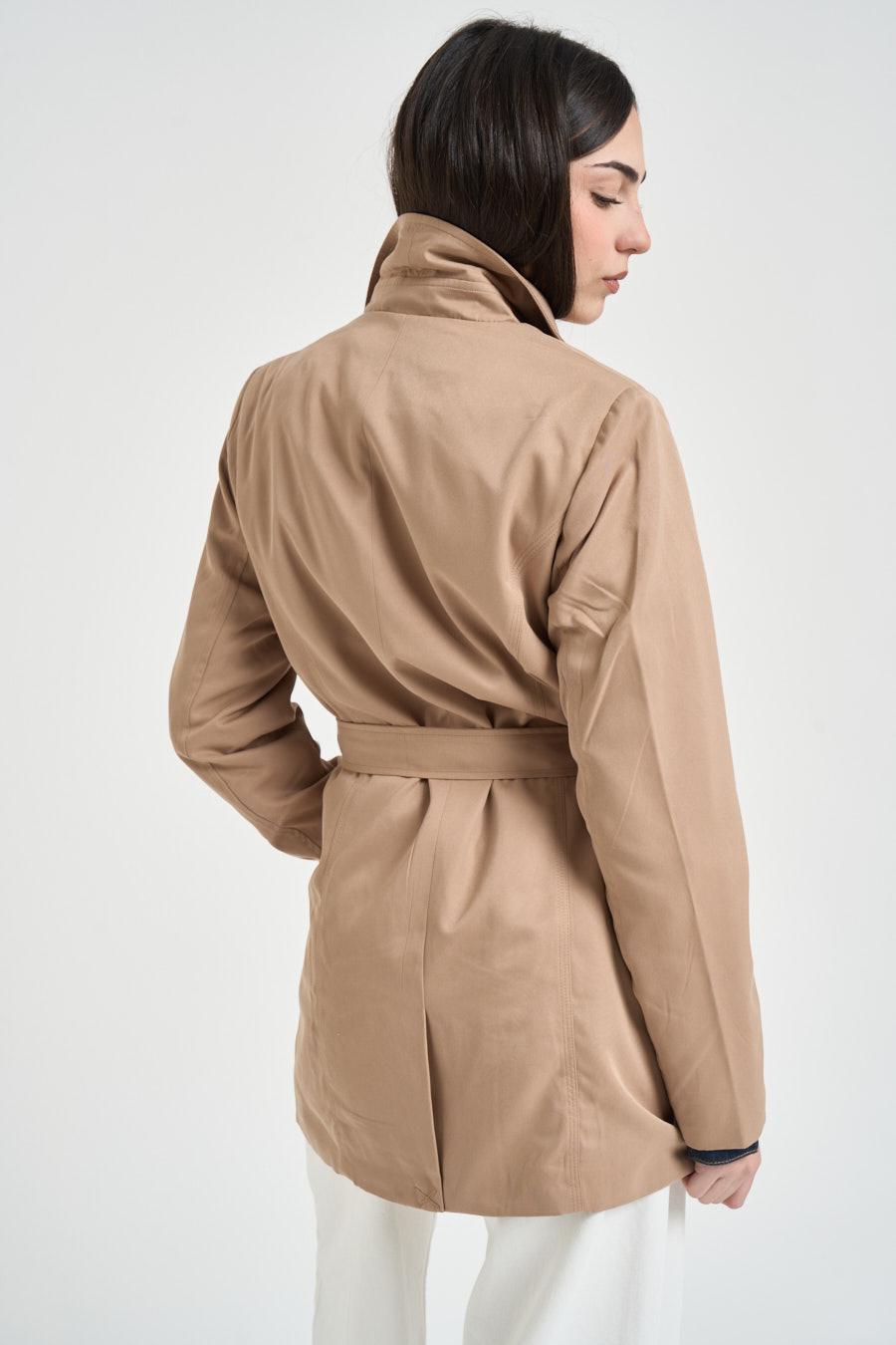 ONLY Trench donna beige. Modello doppiopetto con rever classico, cintura in vita e chiusura con bottoni effetto tartarugato, maniche lunghe e linea leggermente sfiancata. Composizione: 100% cotone. La modella è alta 172cm e indossa la taglia L.