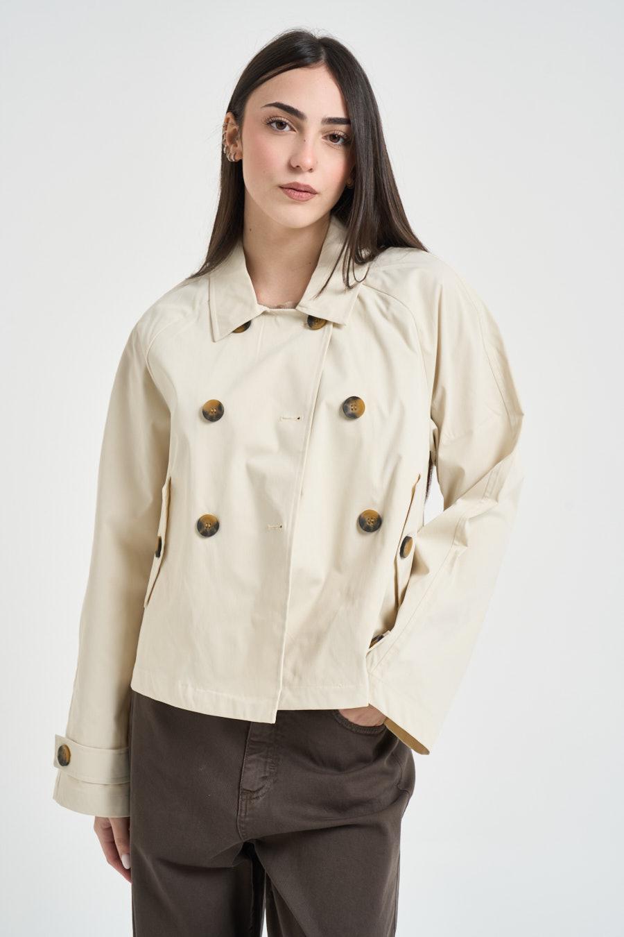 ONLY Trench donna corto beige. Modello doppiopetto realizzato in tessuto leggero. Design con colletto tradizionale e chiusura frontale con bottoni a vista. Linea morbida e leggermente ampia. Maniche lunghe con cinturini regolabili ai polsi. Due tasche laterali con patta e bottone. Composizione: 100% poliestere. La modella è alta 172 cm e indossa la taglia S.