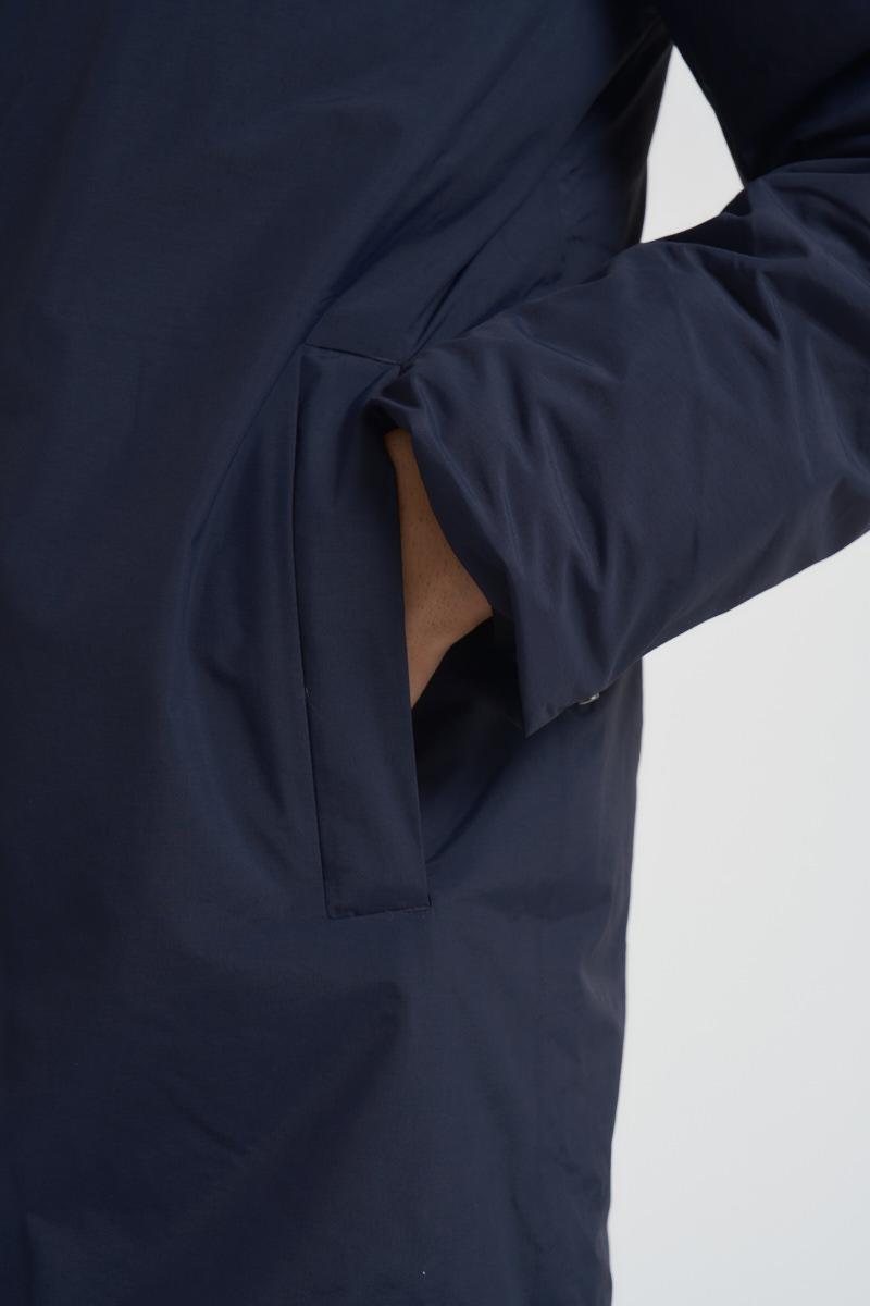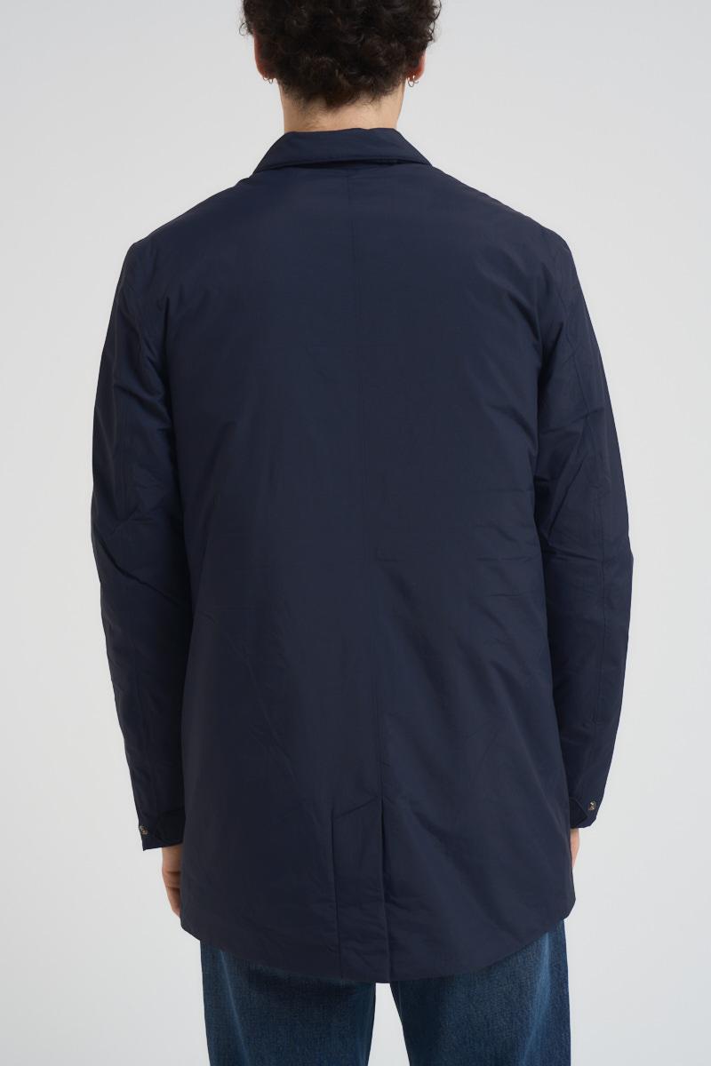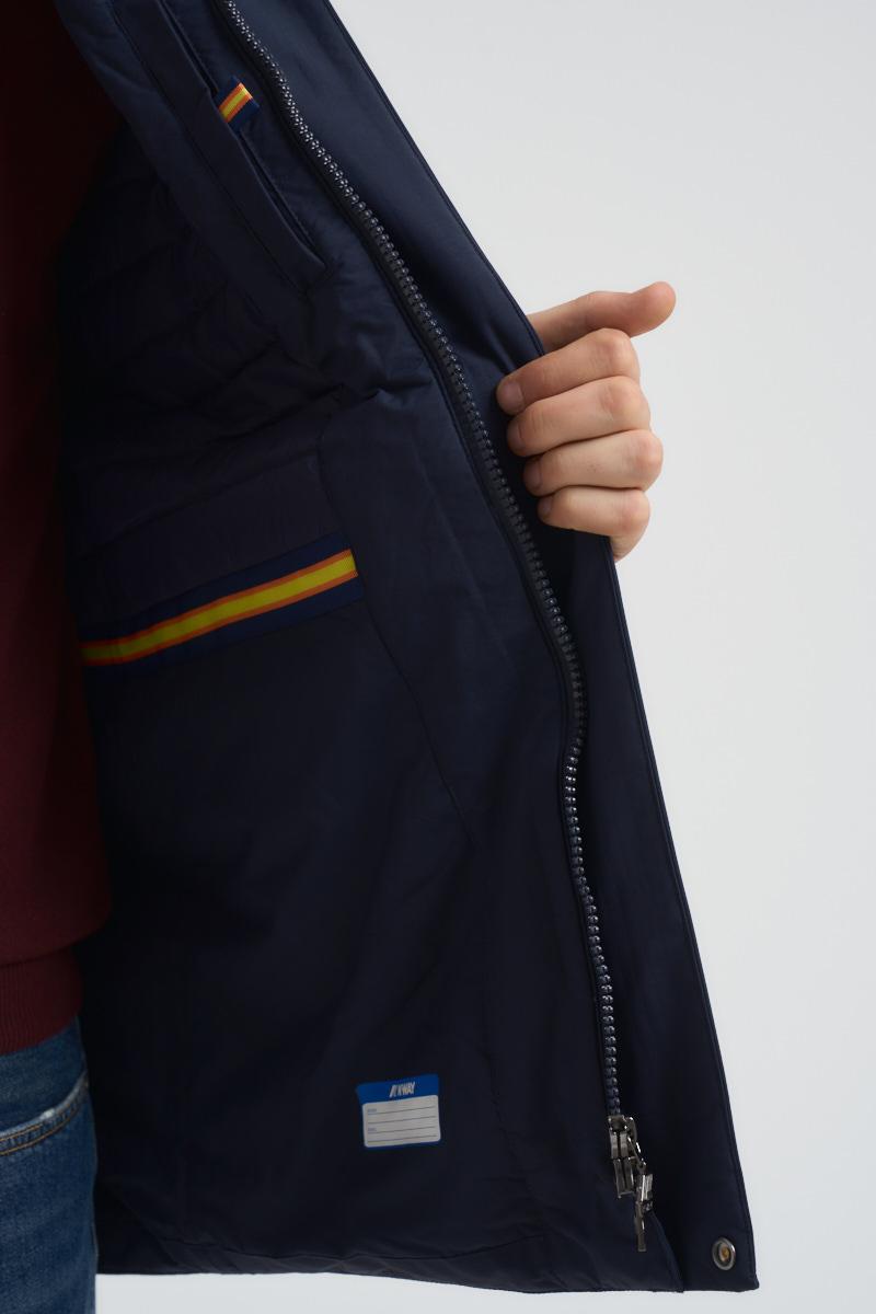 K-WAY Trench uomo midi blu notte. Modello in nylon, impermeabile, idrorepellente, antivento con classico colletto e chiusura a zip e patta. Due tasche con zip e logo in silicone bianco. Composizione: Nylon. Imbottitura: 27% Piumetta Anatra, 3% Piuma Anatra, 70% Poliestere. Il modello è alto 190 cm e indossa la taglia L.