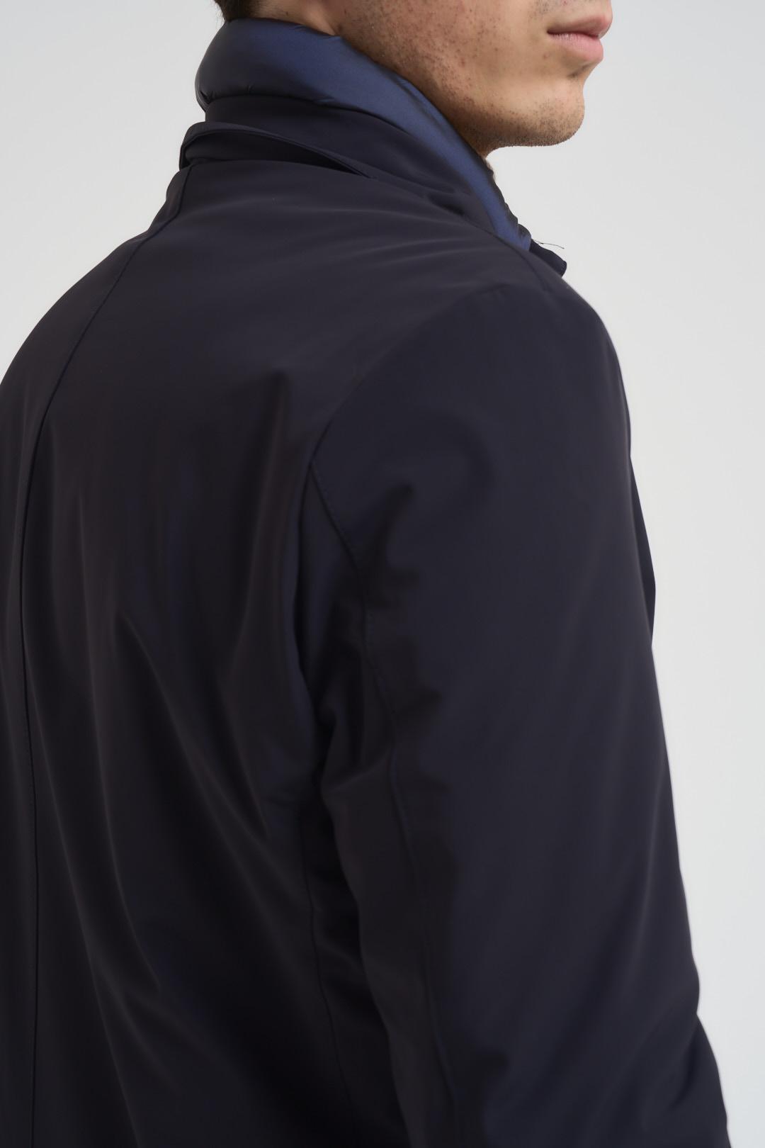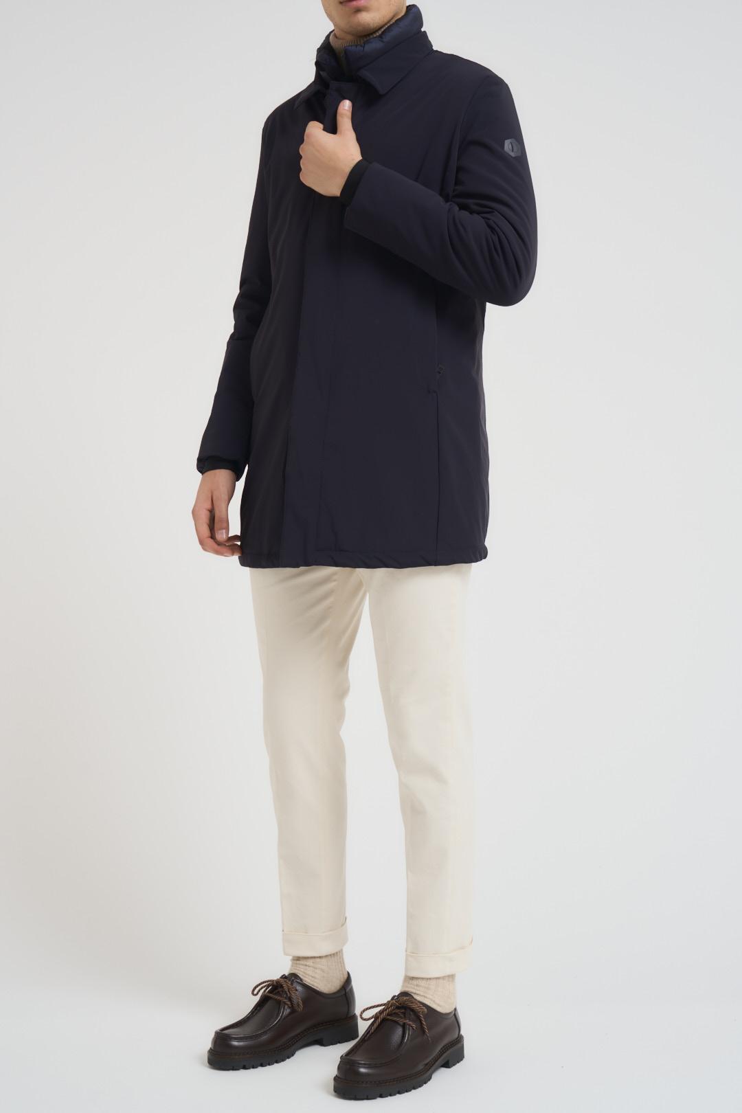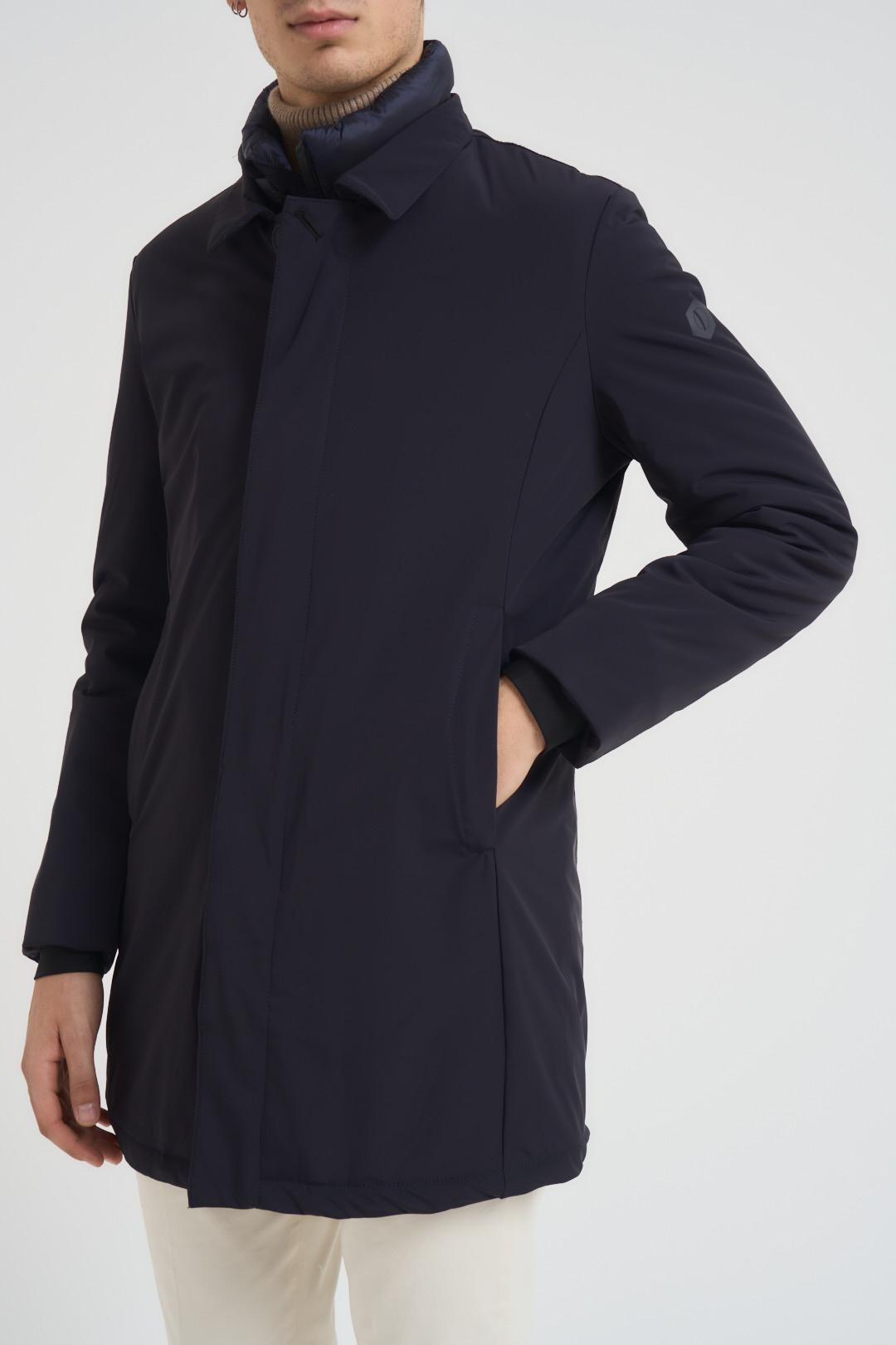 OVERD Trench uomo midi imbottito blu. Modello con chiusura con zip e bottone, doppia imbottitura removibile e piumino interno. Composizione: 92% poliestere 8%elastan. Vestibilità regolare. Il modello è alto 190cm e indossa la taglia L.