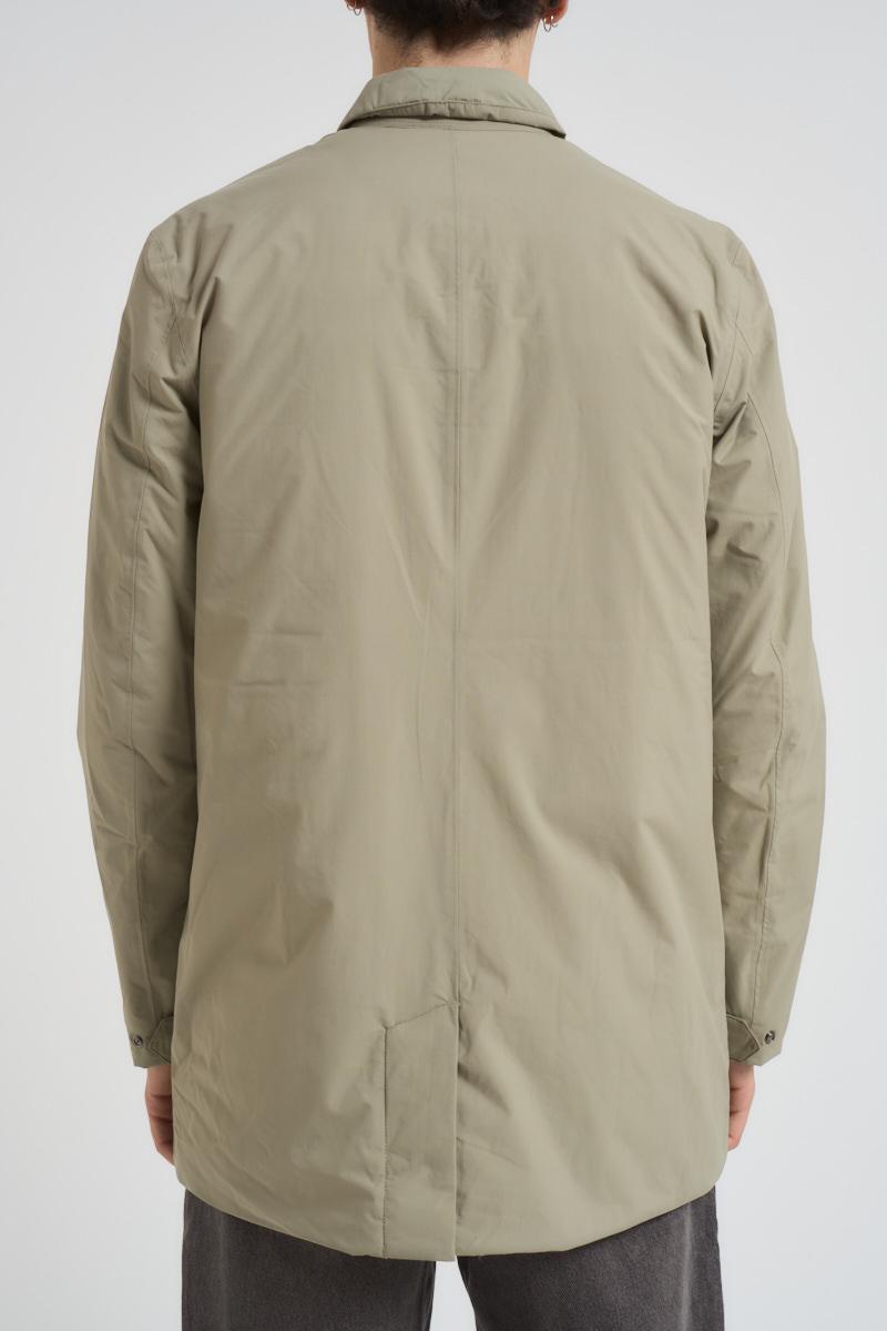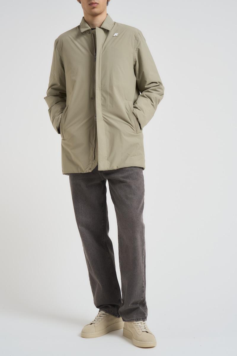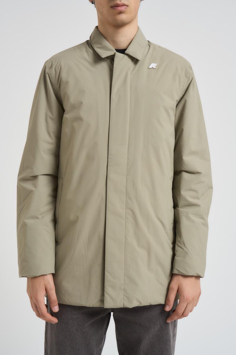 K-WAY Trench uomo midi sabbia. Modello in nylon, impermeabile, idrorepellente, antivento con classico colletto e chiusura a zip e patta. Due tasche con zip e logo in silicone bianco. Composizione: Nylon. Imbottitura: 27% Piumetta Anatra, 3% Piuma Anatra, 70% Poliestere. Il modello è alto 190 cm e indossa la taglia L.