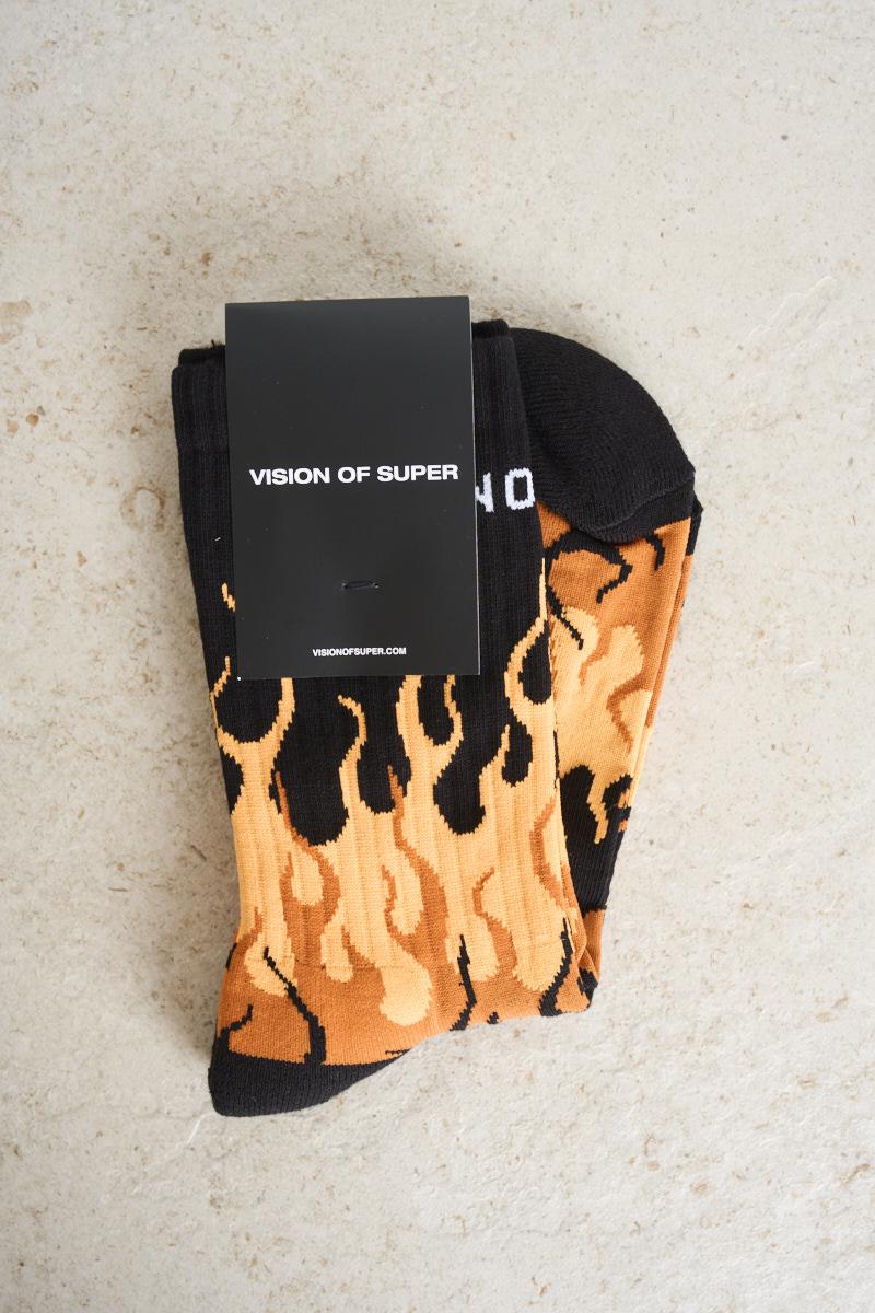 VISION OF SUPER Calze uomo nere e arancioni. Fantasia fiamma arancione e nera. Composizione: 80% cotone, 15% poliestere, 5% spandex.