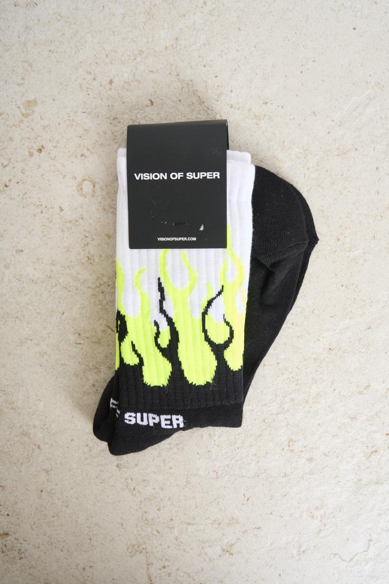 VISION OF SUPER Calze uomo nere e gialle. Fantasia fiamma bianca e gialla. Composizione: 80% cotone, 15% poliestere, 5% spandex.